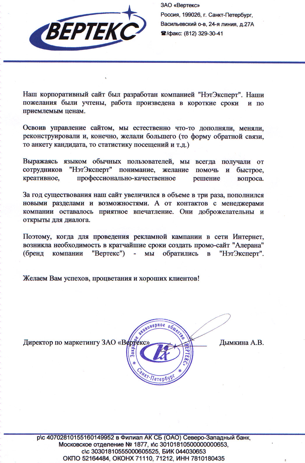 "...В заявленные сроки мы получили на утверждение макет дизайна сайта. Менежер нашего проекта оперативно и четко осуществляла коммуникации, решала все рабочие вопросы... "